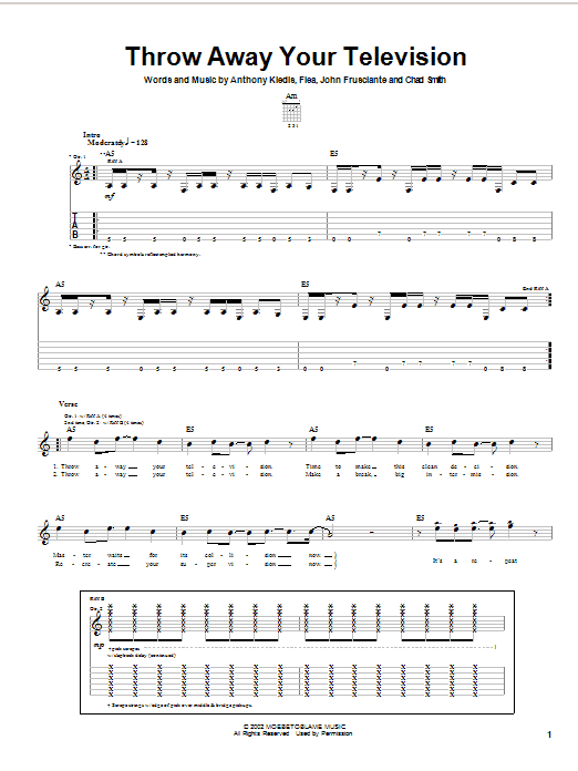 Download or print Red Hot Chili Peppers Throw Away Your Television sheet music, chords and digital score arranged for Guitar Tab. This Rock score includes 5 page(s).