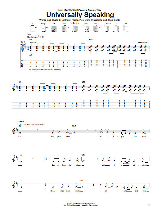 Download or print Red Hot Chili Peppers Universally Speaking sheet music, chords and digital score arranged for Piano, Vocal & Guitar Chords (Right-Hand Melody). This Pop score includes 7 page(s).
