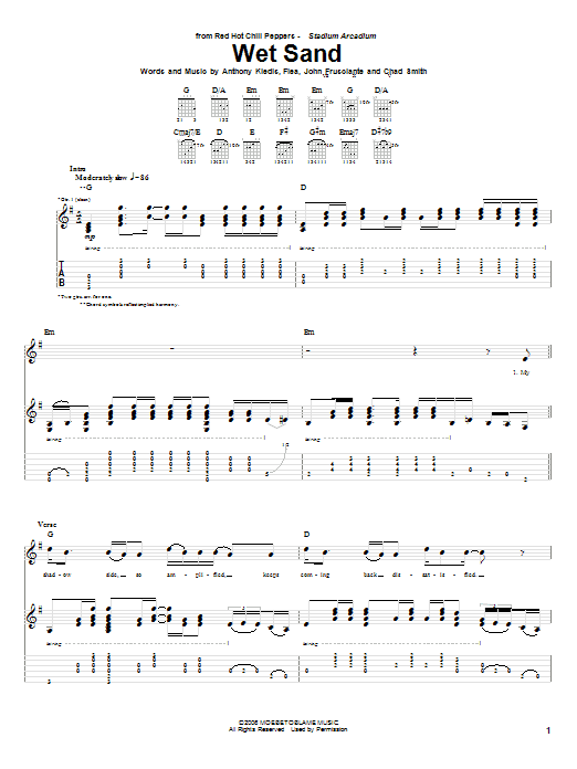 Download or print Red Hot Chili Peppers Wet Sand sheet music, chords and digital score arranged for Guitar Tab. This Pop score includes 18 page(s).
