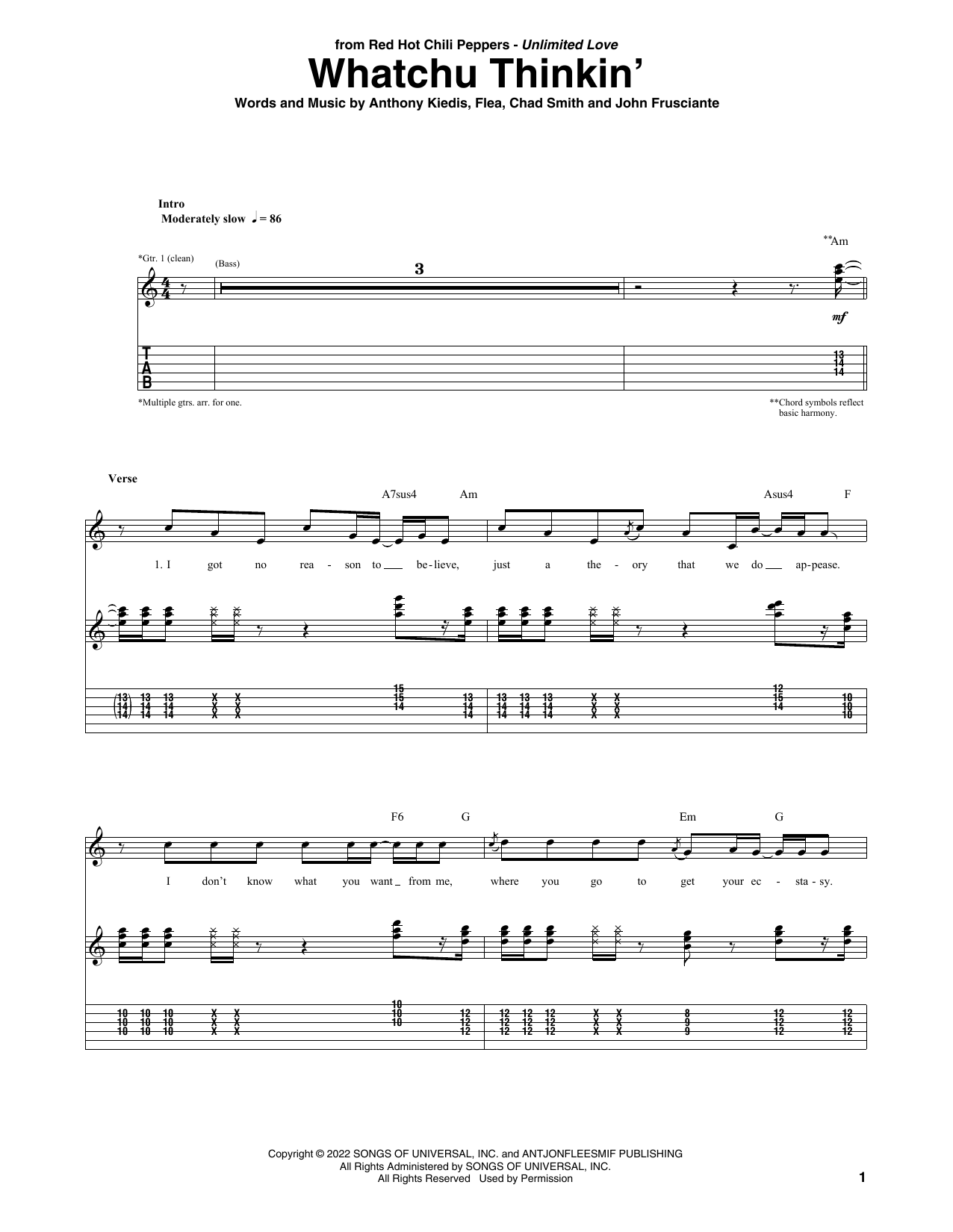Download or print Red Hot Chili Peppers Whatchu Thinkin' sheet music, chords and digital score arranged for Guitar Tab. This Rock score includes 9 page(s).