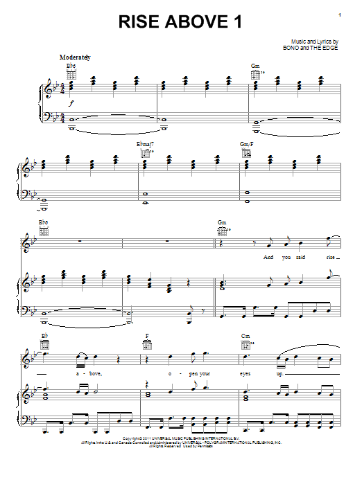 Download or print Bono & The Edge Rise Above 1 sheet music, chords and digital score arranged for Piano, Vocal & Guitar Chords (Right-Hand Melody). This Pop score includes 8 page(s).