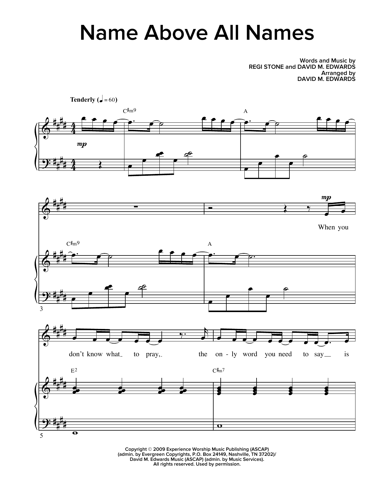 Download or print Regi Stone and David M. Edwards Name Above All Names (arr. David M. Edwards) sheet music, chords and digital score arranged for Piano & Vocal. This Sacred score includes 8 page(s).