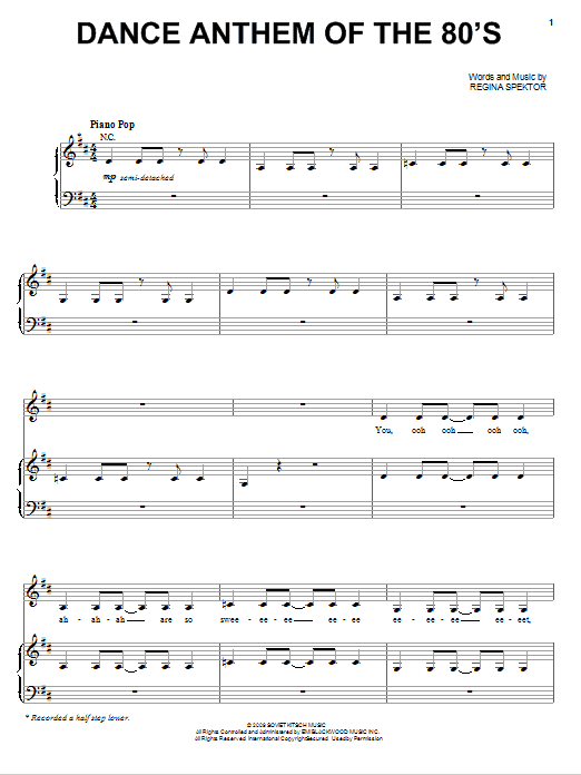 Download or print Regina Spektor Dance Anthem Of The 80's sheet music, chords and digital score arranged for Piano, Vocal & Guitar Chords (Right-Hand Melody). This Pop score includes 11 page(s).