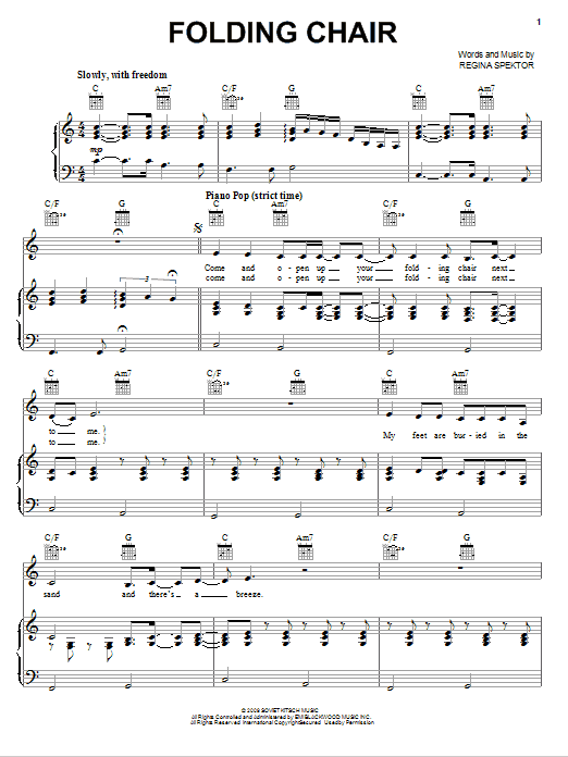 Download or print Regina Spektor Folding Chair sheet music, chords and digital score arranged for Piano, Vocal & Guitar Chords (Right-Hand Melody). This Pop score includes 8 page(s).