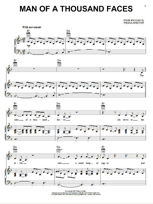 Download or print Regina Spektor Man Of A Thousand Faces sheet music, chords and digital score arranged for Piano, Vocal & Guitar Chords (Right-Hand Melody). This Pop score includes 6 page(s).
