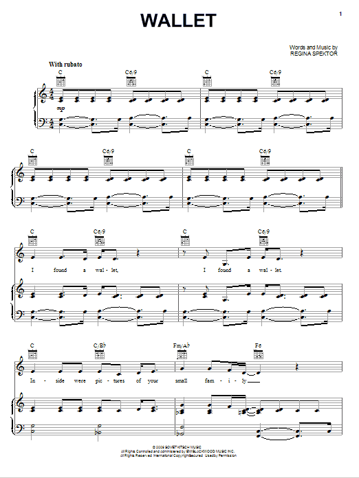 Download or print Regina Spektor Wallet sheet music, chords and digital score arranged for Piano, Vocal & Guitar Chords (Right-Hand Melody). This Pop score includes 6 page(s).