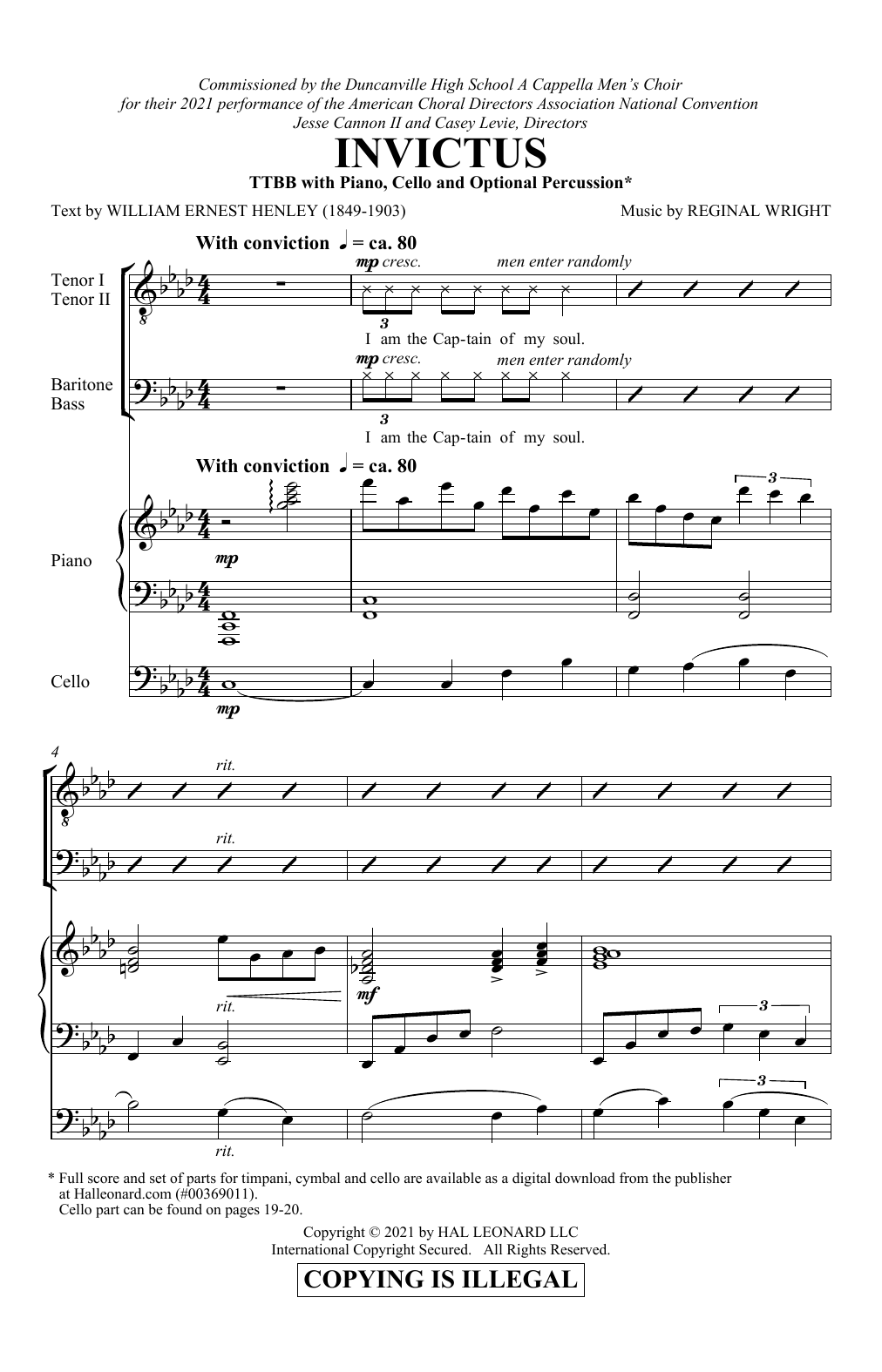 Download or print Reginal Wright Invictus sheet music, chords and digital score arranged for TTBB Choir. This Concert score includes 18 page(s).
