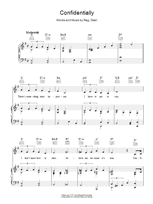 Download or print Reginald Dixon Confidentially sheet music, chords and digital score arranged for Piano, Vocal & Guitar Chords. This Standards score includes 4 page(s).