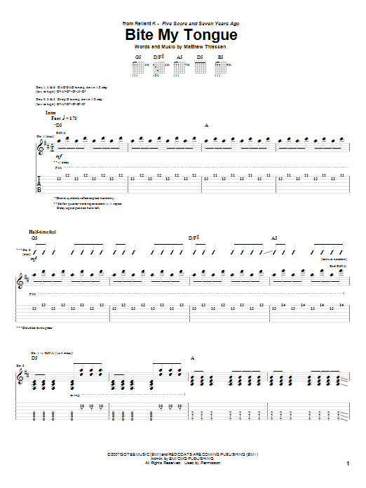 Download or print Relient K Bite My Tongue sheet music, chords and digital score arranged for Guitar Tab. This Pop score includes 8 page(s).