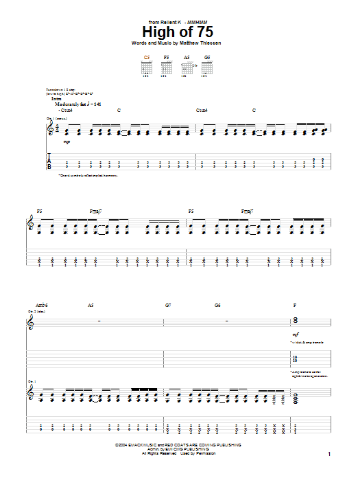 Download or print Relient K High Of 75 sheet music, chords and digital score arranged for Guitar Tab. This Christian score includes 8 page(s).