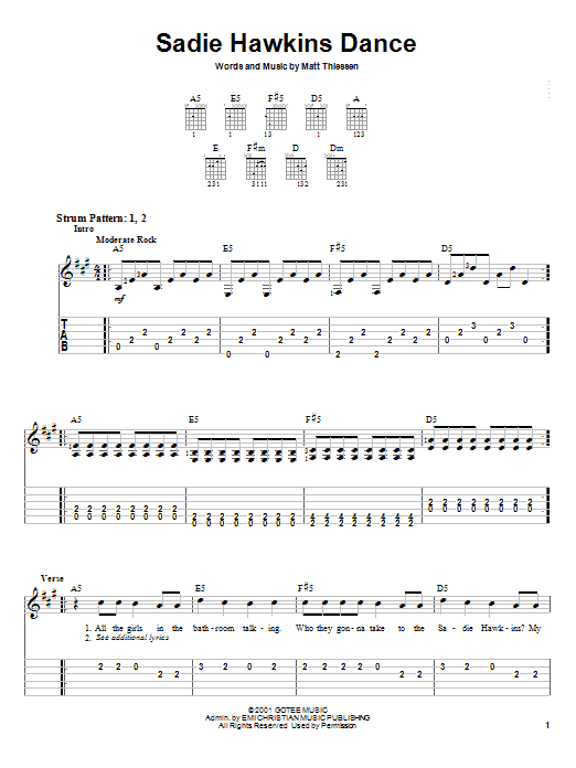 Download or print Relient K Sadie Hawkins Dance sheet music, chords and digital score arranged for Easy Guitar Tab. This Christian score includes 4 page(s).