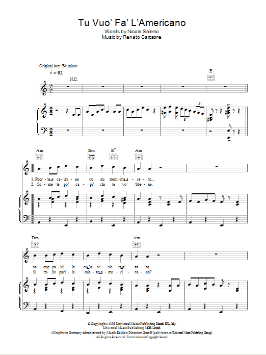 Download or print Renato Carosone Tu Vuo Fa L'Americano sheet music, chords and digital score arranged for Piano, Vocal & Guitar Chords. This Jazz score includes 6 page(s).
