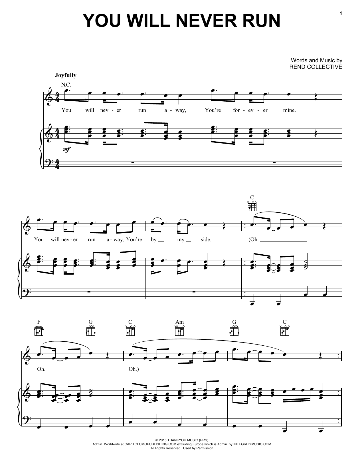 Download or print Rend Collective You Will Never Run sheet music, chords and digital score arranged for Piano, Vocal & Guitar Chords (Right-Hand Melody). This Christian score includes 5 page(s).
