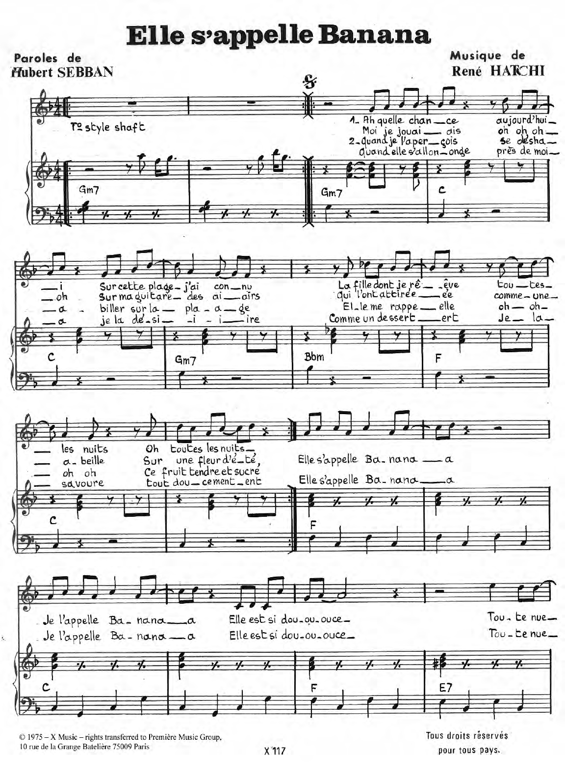 Download or print Rene Hatchy Elle S'appelle Banana sheet music, chords and digital score arranged for Piano & Vocal. This Pop score includes 2 page(s).