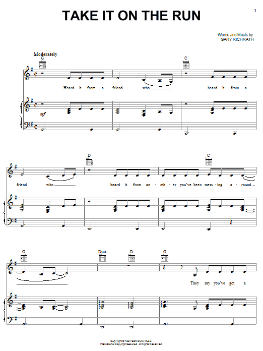 Download or print REO Speedwagon Take It On The Run sheet music, chords and digital score arranged for Piano, Vocal & Guitar Chords (Right-Hand Melody). This Love score includes 5 page(s).
