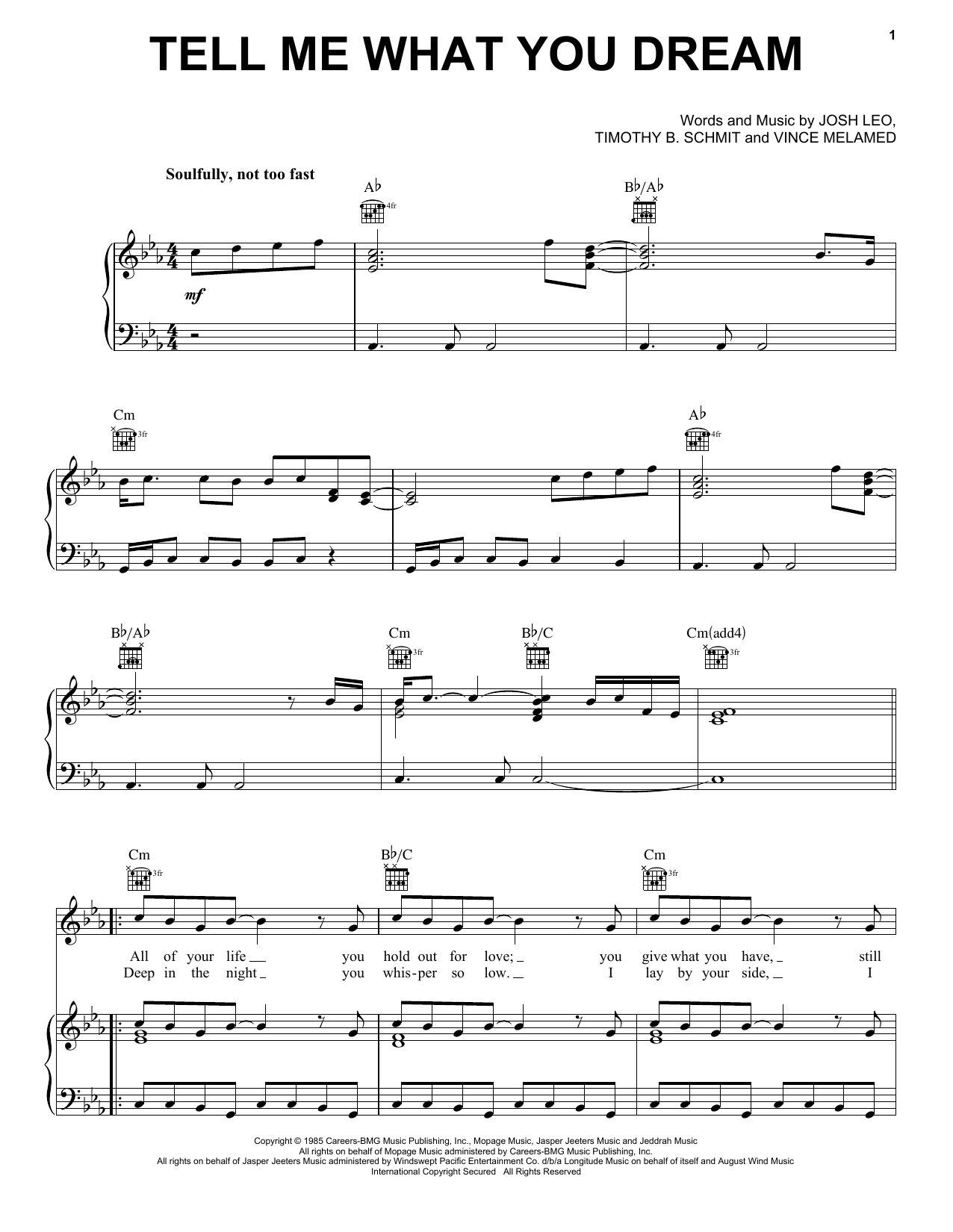 Download or print Restless Heart Tell Me What You Dream sheet music, chords and digital score arranged for Piano, Vocal & Guitar Chords (Right-Hand Melody). This Pop score includes 5 page(s).