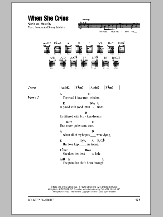 Download or print Restless Heart When She Cries sheet music, chords and digital score arranged for Piano, Vocal & Guitar Chords (Right-Hand Melody). This Country score includes 4 page(s).