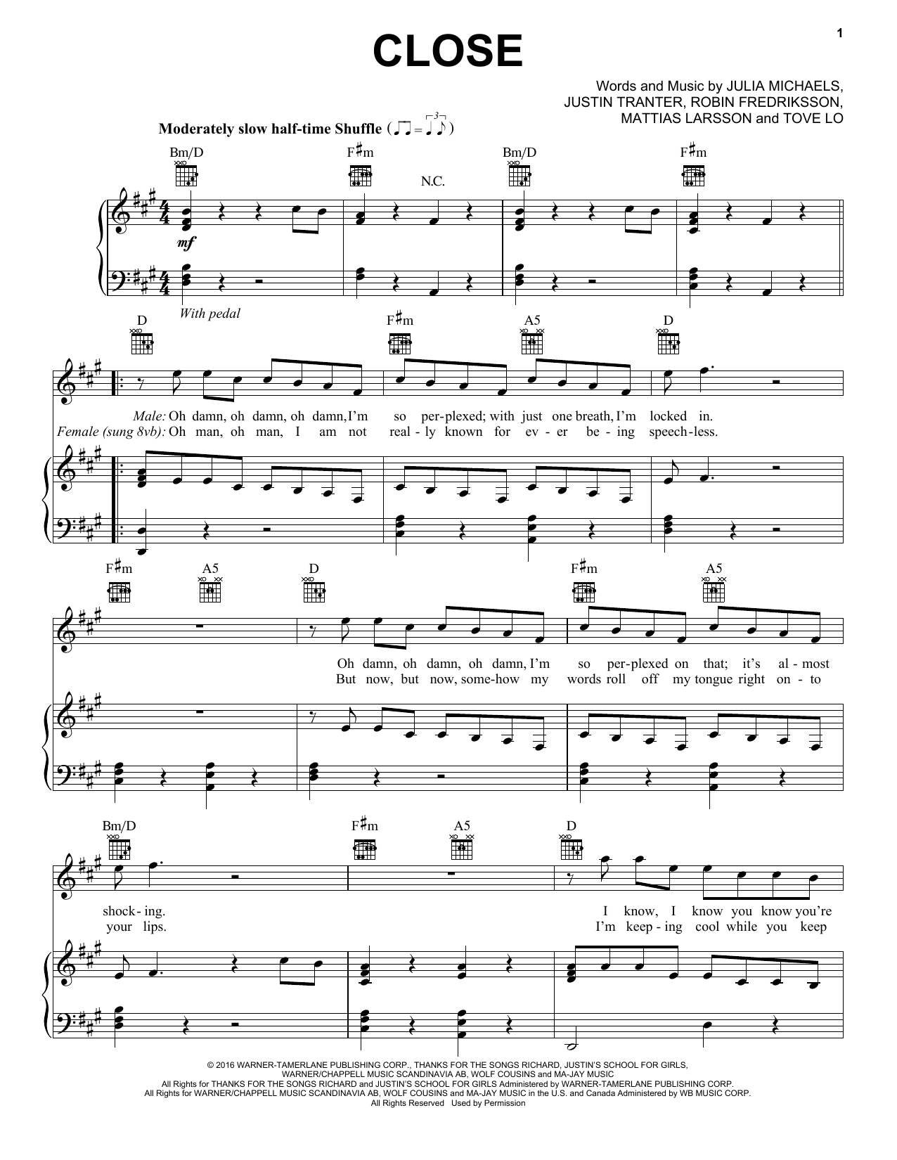 Download or print Nick Jonas feat. Tove Lo Close sheet music, chords and digital score arranged for Piano, Vocal & Guitar Chords (Right-Hand Melody). This Pop score includes 6 page(s).
