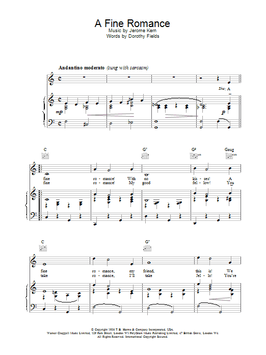 Download or print Frank Sinatra A Fine Romance sheet music, chords and digital score arranged for Piano, Vocal & Guitar Chords. This Film/TV score includes 6 page(s).