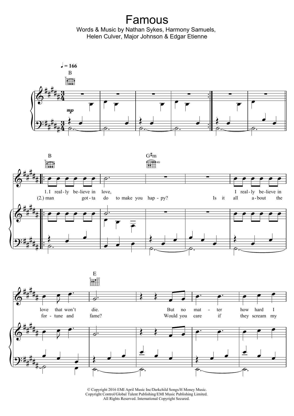 Download or print Nathan Sykes Famous sheet music, chords and digital score arranged for Piano, Vocal & Guitar Chords. This Pop score includes 7 page(s).