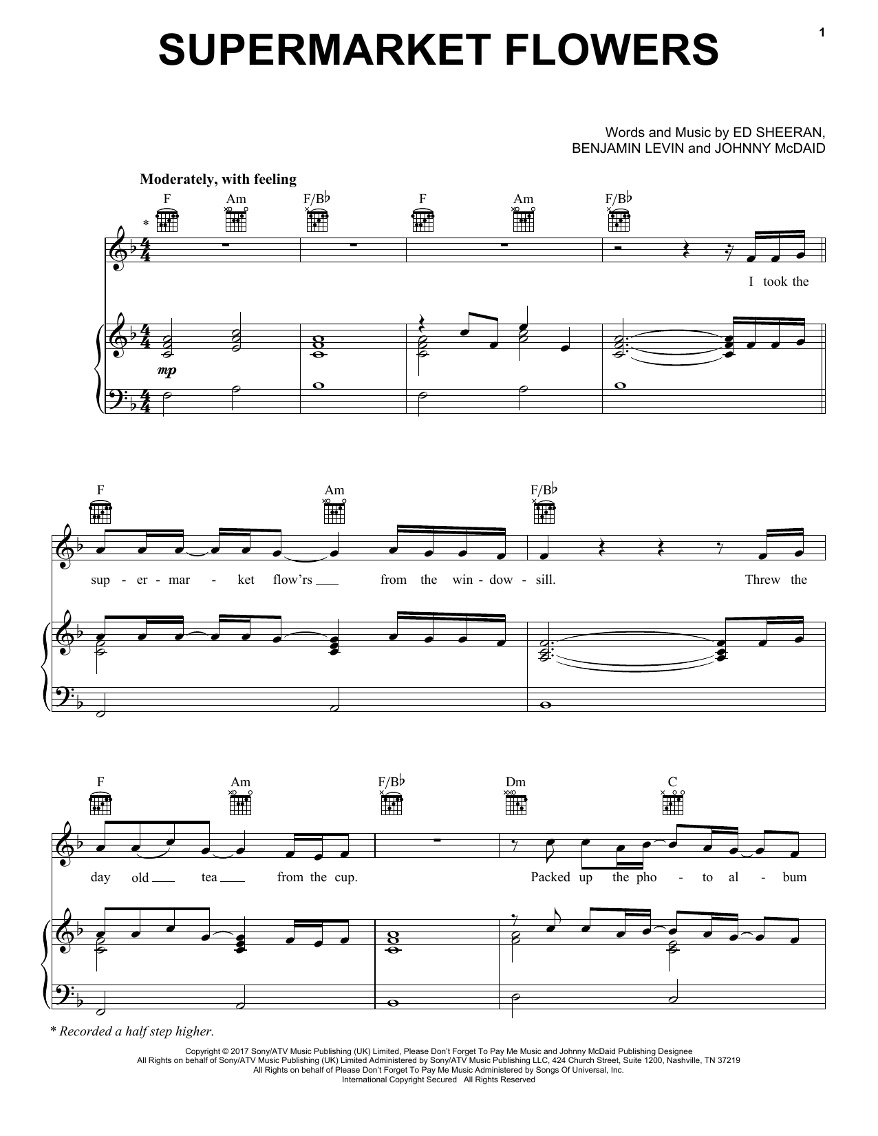 Download or print Ed Sheeran Supermarket Flowers sheet music, chords and digital score arranged for Piano, Vocal & Guitar Chords (Right-Hand Melody). This Pop score includes 4 page(s).