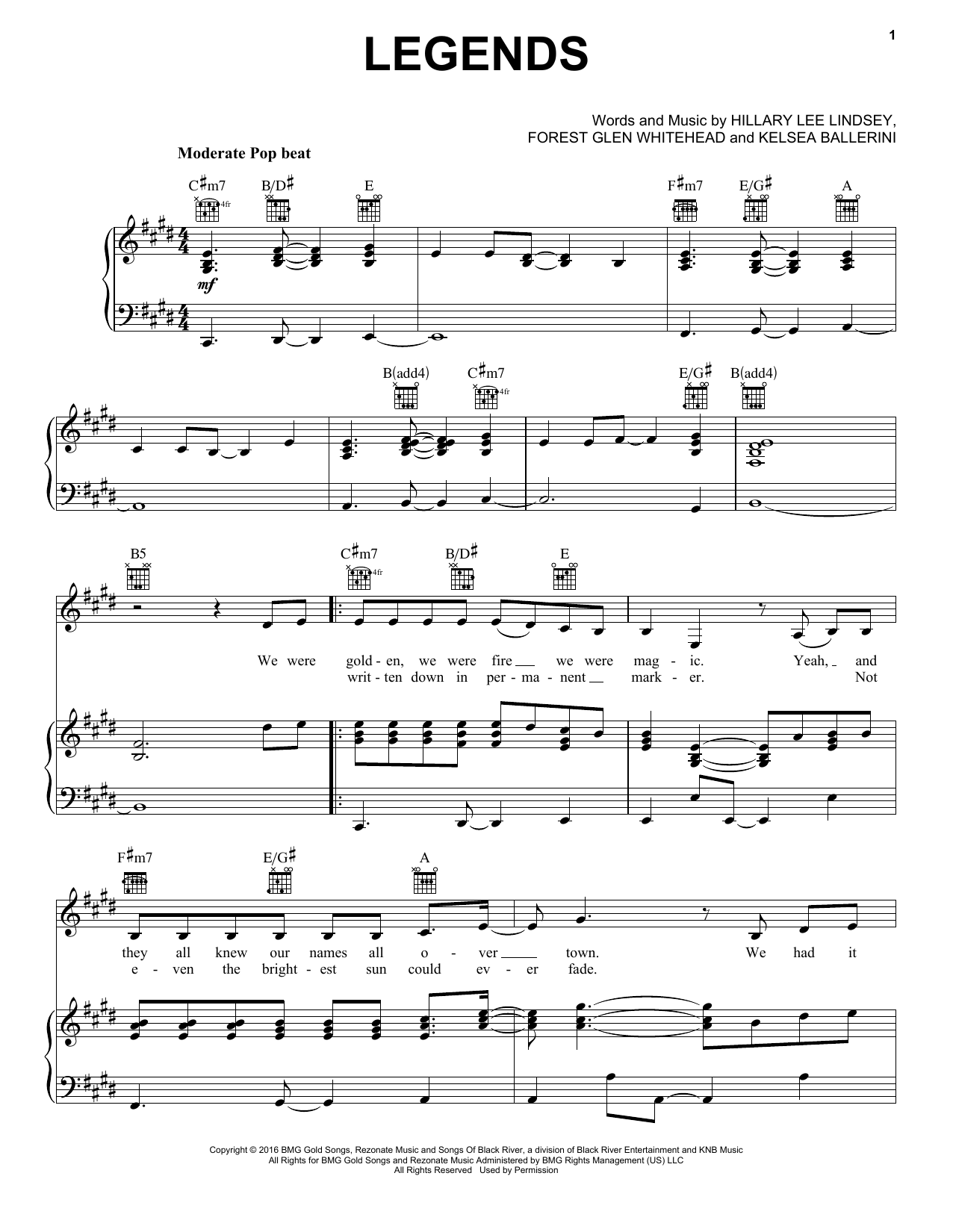 Download or print Kelsea Ballerini Legends sheet music, chords and digital score arranged for Piano, Vocal & Guitar Chords (Right-Hand Melody). This Pop score includes 6 page(s).