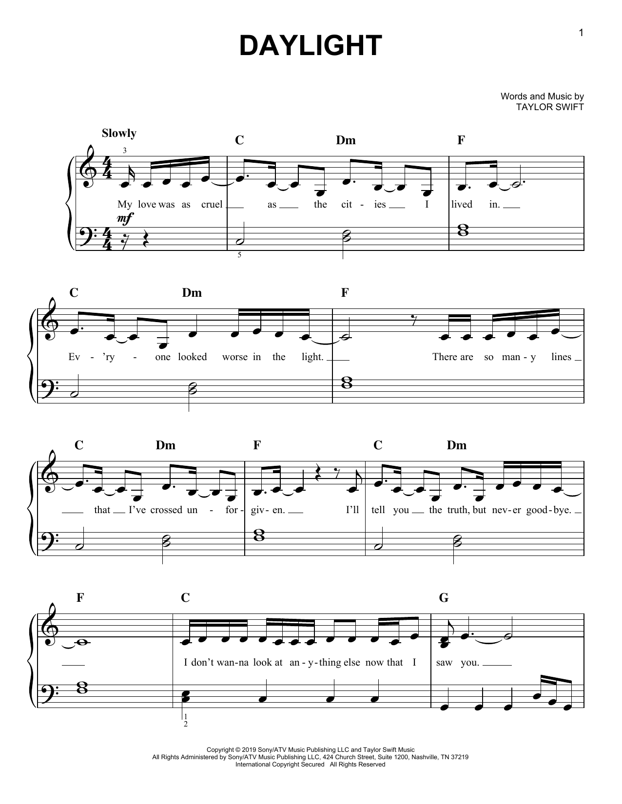 Download or print Taylor Swift Daylight sheet music, chords and digital score arranged for Easy Piano. This Pop score includes 9 page(s).