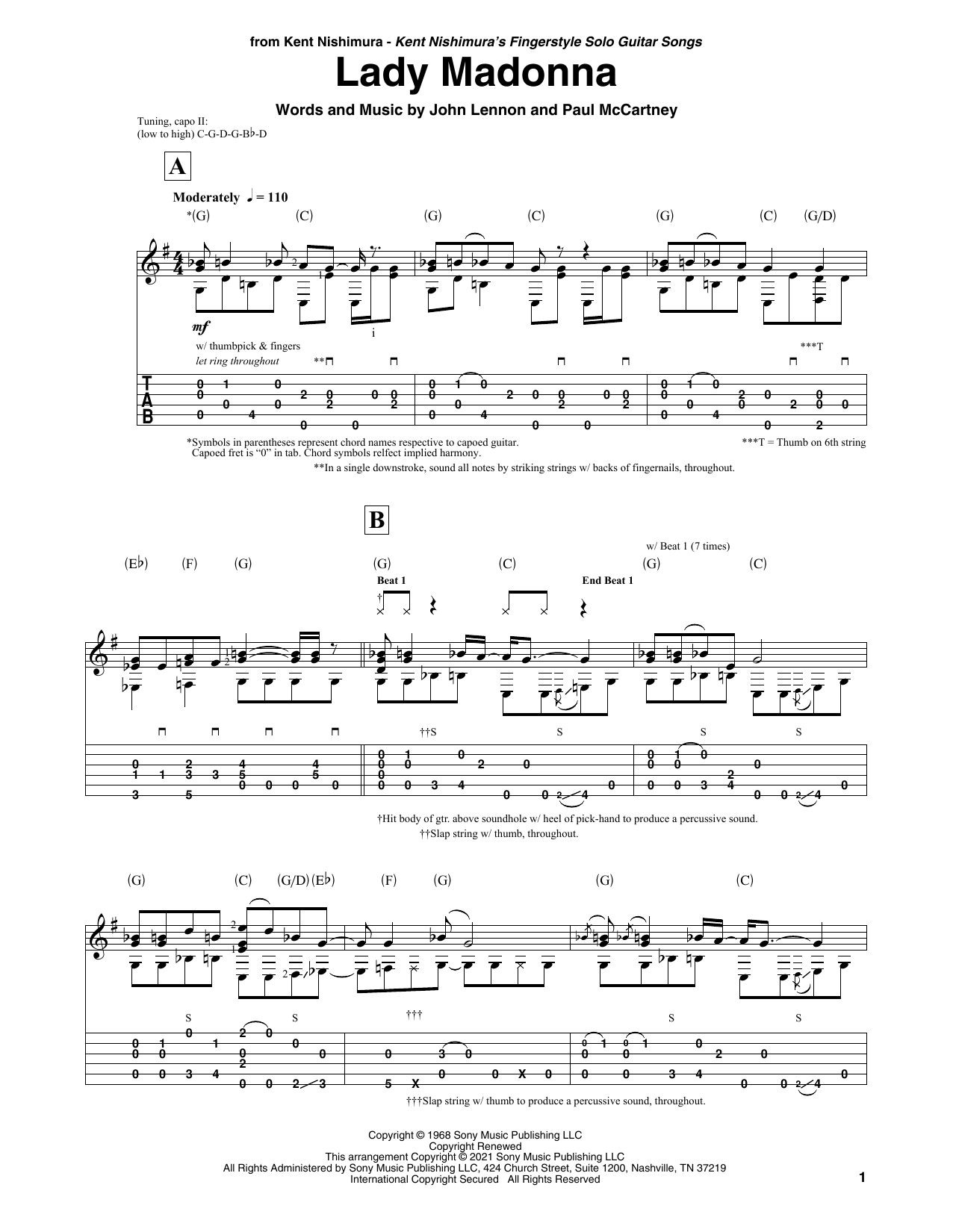 Download or print The Beatles Lady Madonna (arr. Kent Nishimura) sheet music, chords and digital score arranged for Solo Guitar. This Pop score includes 4 page(s).