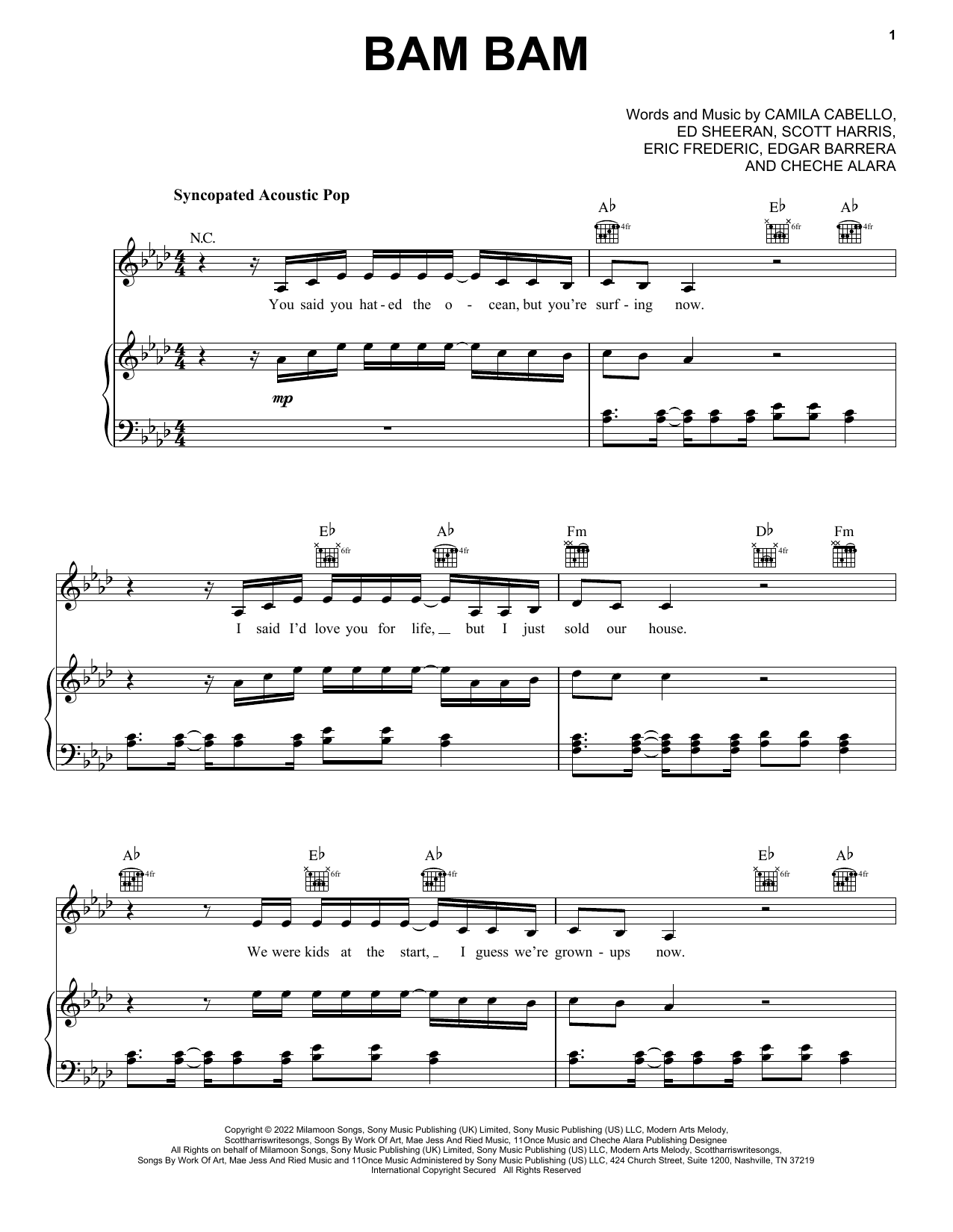 Download or print Camila Cabello Bam Bam (feat. Ed Sheeran) sheet music, chords and digital score arranged for Piano, Vocal & Guitar Chords (Right-Hand Melody). This Pop score includes 8 page(s).