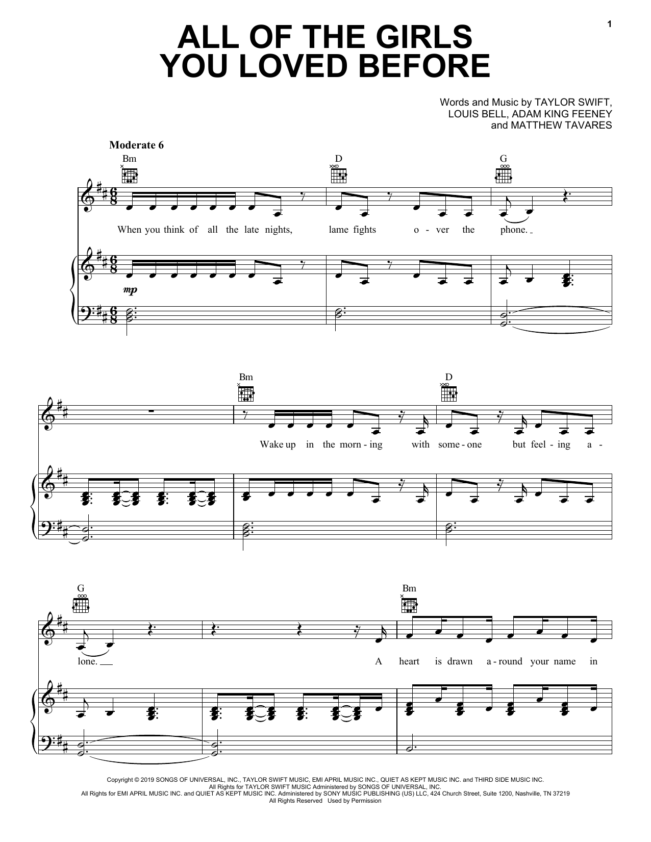 Download or print Taylor Swift All Of The Girls You Loved Before sheet music, chords and digital score arranged for Piano, Vocal & Guitar Chords (Right-Hand Melody). This Pop score includes 7 page(s).