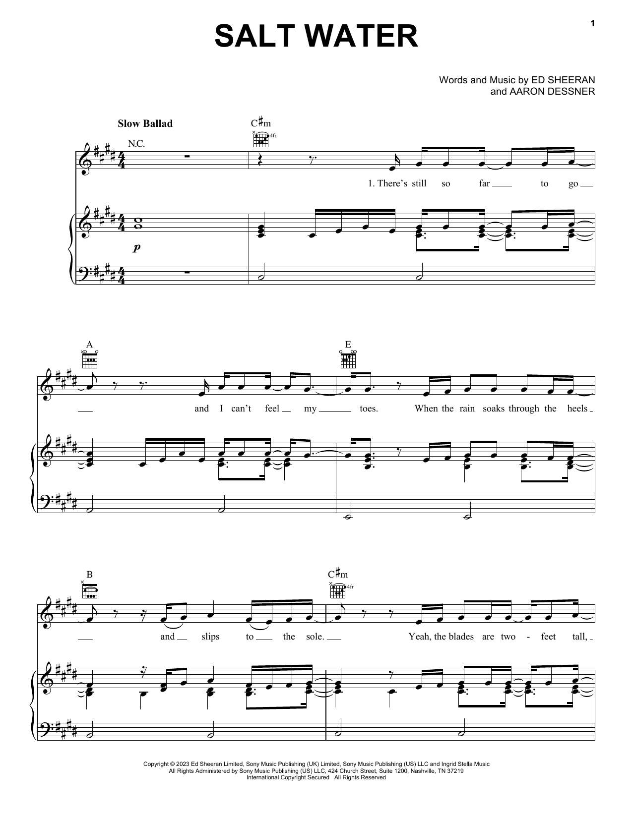 Download or print Ed Sheeran Salt Water sheet music, chords and digital score arranged for Piano, Vocal & Guitar Chords (Right-Hand Melody). This Pop score includes 6 page(s).