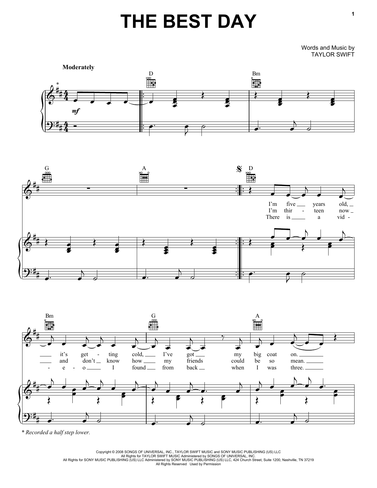 Download or print Taylor Swift The Best Day sheet music, chords and digital score arranged for Easy Piano. This Pop score includes 6 page(s).