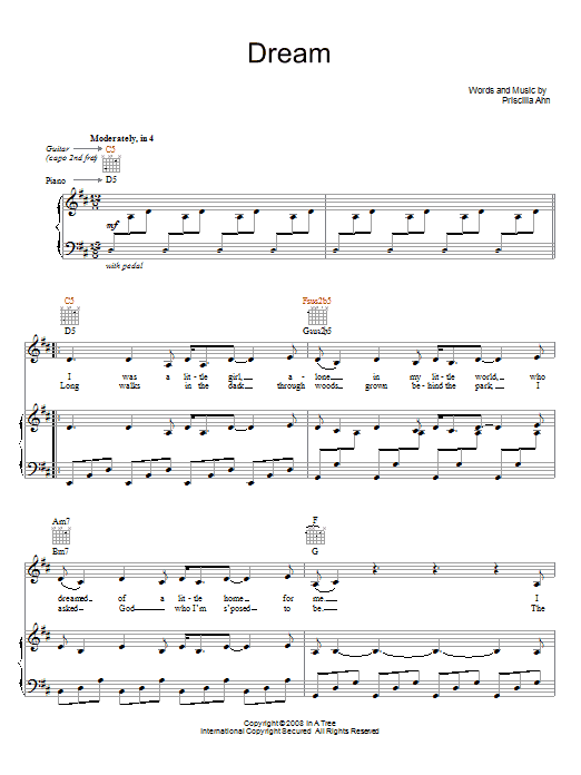 Download or print Priscilla Ahn Dream sheet music, chords and digital score arranged for Piano, Vocal & Guitar Chords (Right-Hand Melody). This Folk score includes 4 page(s).