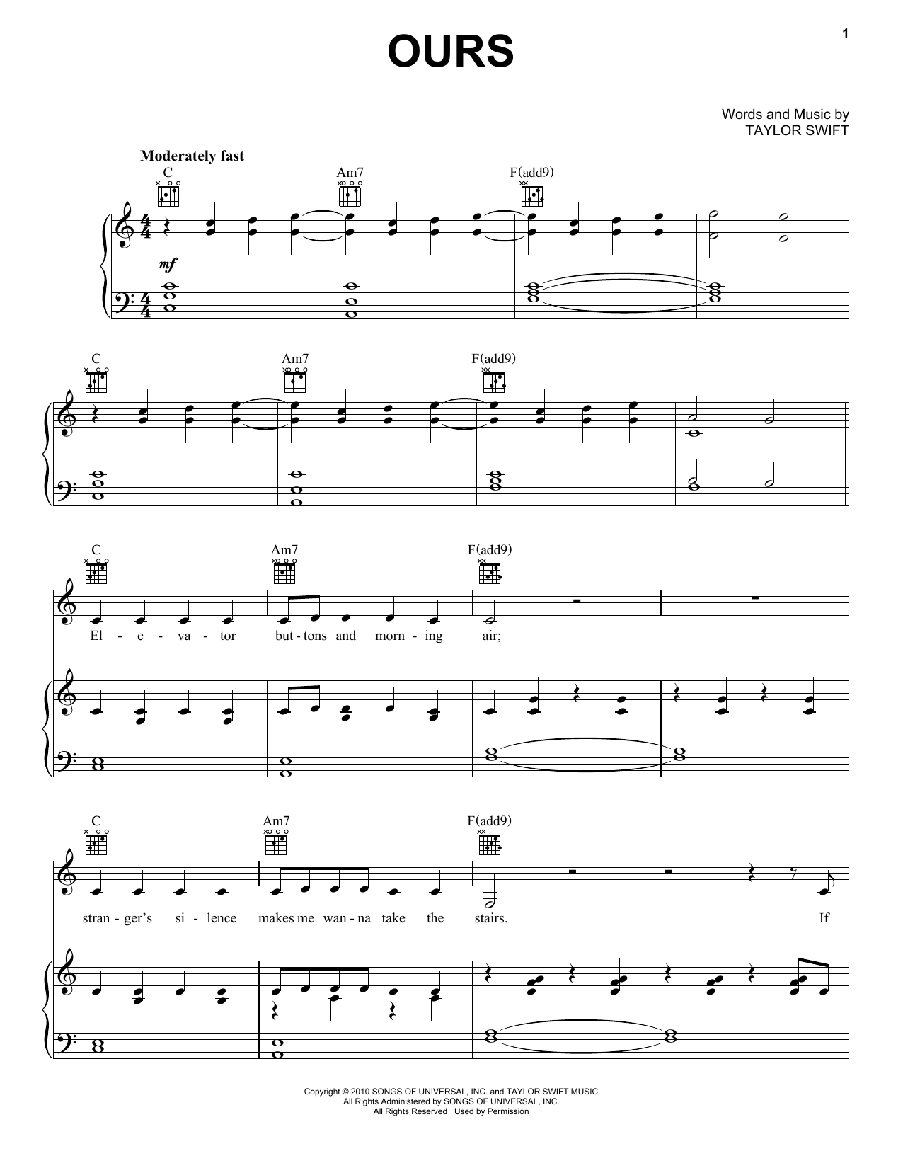 Download or print Taylor Swift Ours sheet music, chords and digital score arranged for Piano, Vocal & Guitar Chords (Right-Hand Melody). This Country score includes 8 page(s).