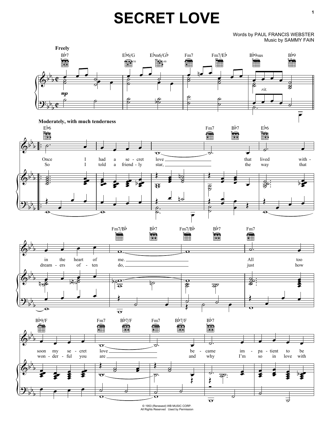 Download or print Frank Sinatra Secret Love sheet music, chords and digital score arranged for Piano, Vocal & Guitar Chords (Right-Hand Melody). This Jazz score includes 2 page(s).