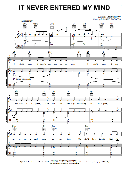 Download or print Frank Sinatra It Never Entered My Mind sheet music, chords and digital score arranged for Piano, Vocal & Guitar Chords (Right-Hand Melody). This Jazz score includes 4 page(s).