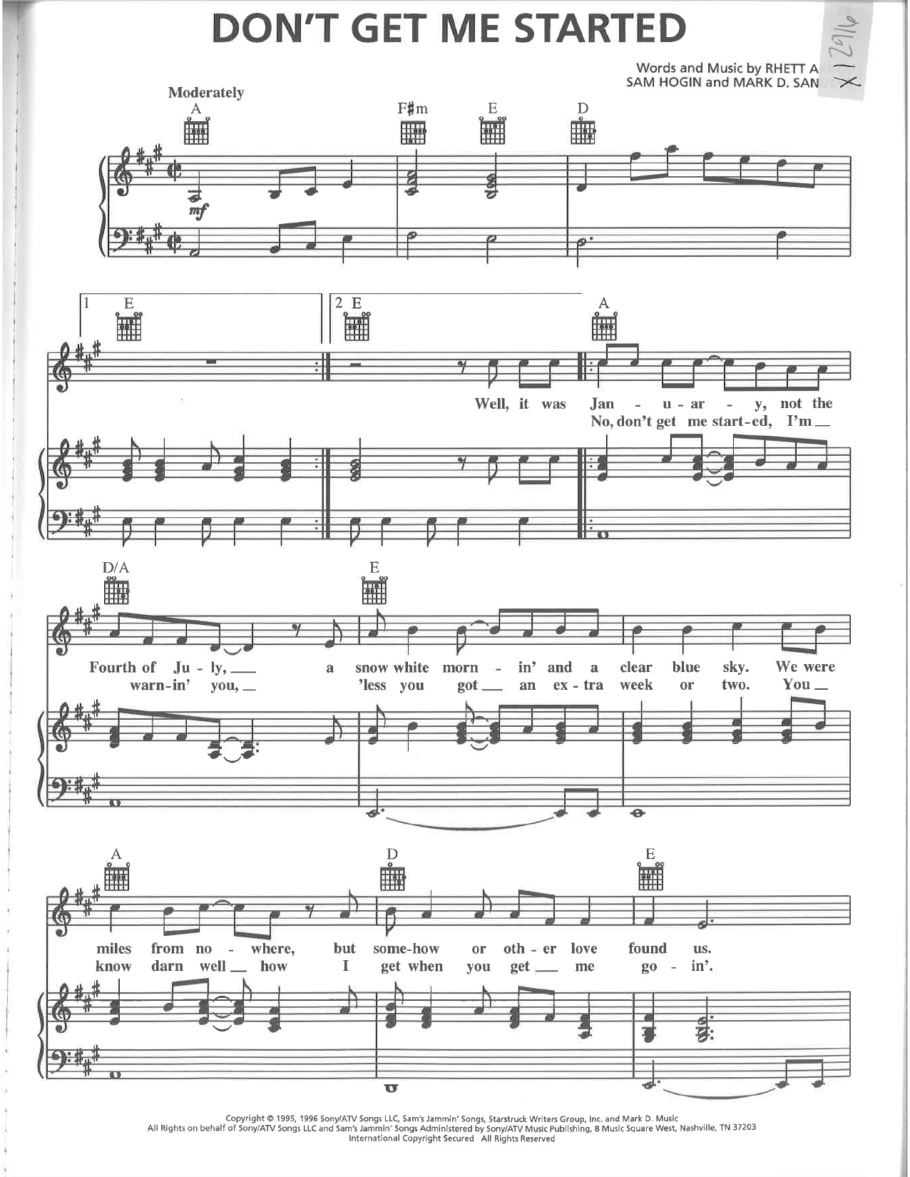 Download or print Rhett Akins Don't Get Me Started sheet music, chords and digital score arranged for Piano, Vocal & Guitar Chords (Right-Hand Melody). This Country score includes 5 page(s).