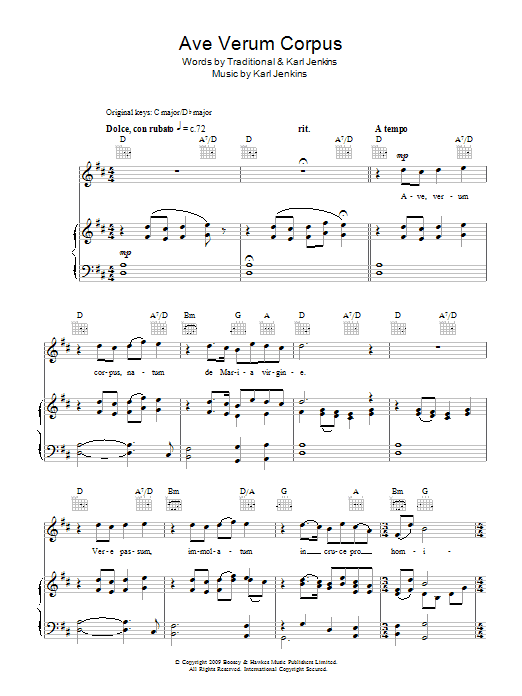 Download or print Rhydian Ave Verum Corpus sheet music, chords and digital score arranged for Piano, Vocal & Guitar Chords. This Classical score includes 5 page(s).