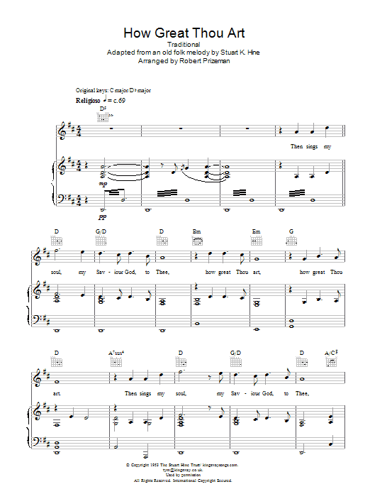 Download or print Rhydian How Great Thou Art sheet music, chords and digital score arranged for Piano, Vocal & Guitar Chords. This Hymn score includes 6 page(s).