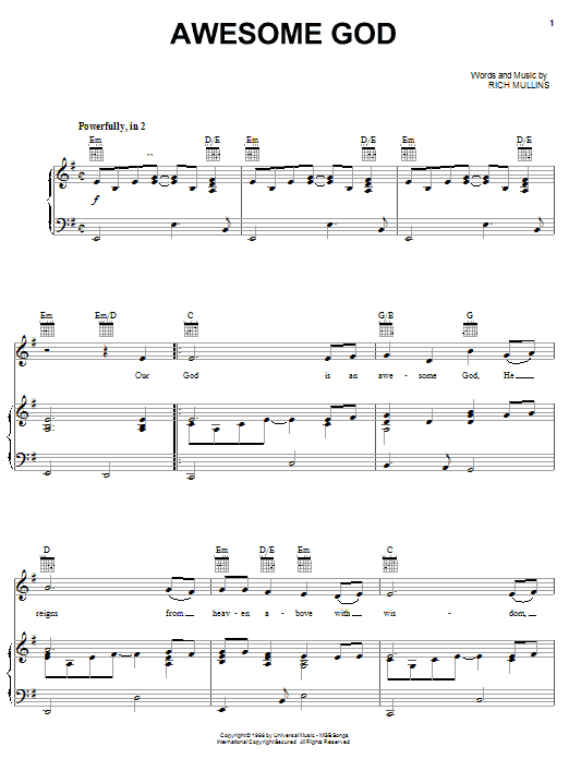 Download or print Rich Mullins Awesome God (Chorus Only) sheet music, chords and digital score arranged for Piano, Vocal & Guitar Chords (Right-Hand Melody). This Children score includes 2 page(s).