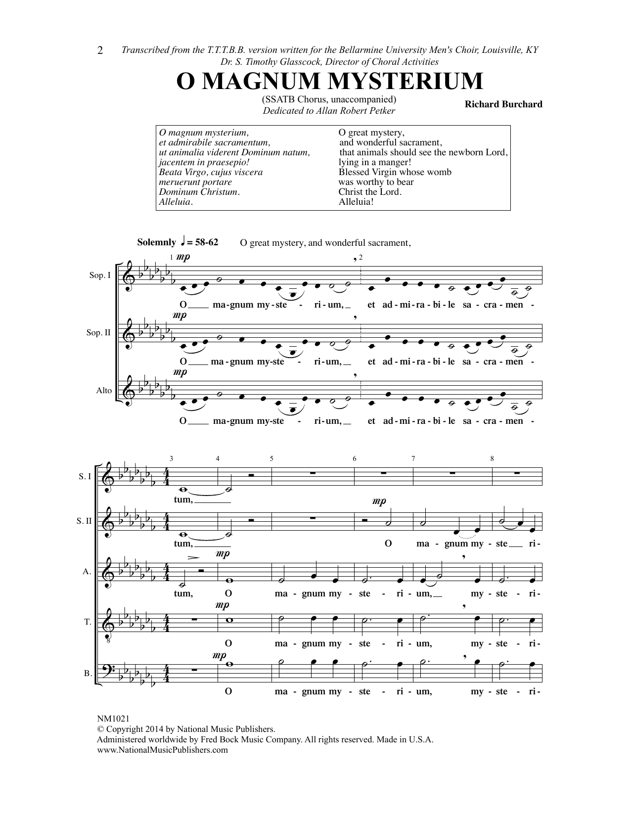Download or print Richard Burchard O Magnum Mysterium sheet music, chords and digital score arranged for TTBB Choir. This Concert score includes 7 page(s).