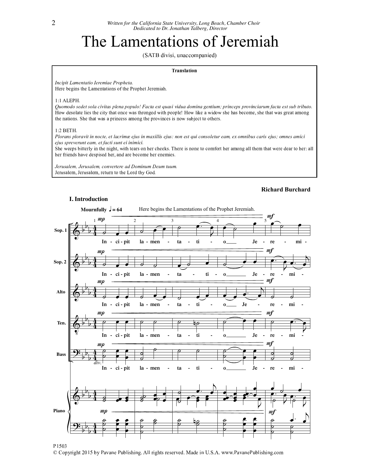 Download or print Richard Burchard The Lamentations of Jeremiah sheet music, chords and digital score arranged for Choir. This Concert score includes 11 page(s).