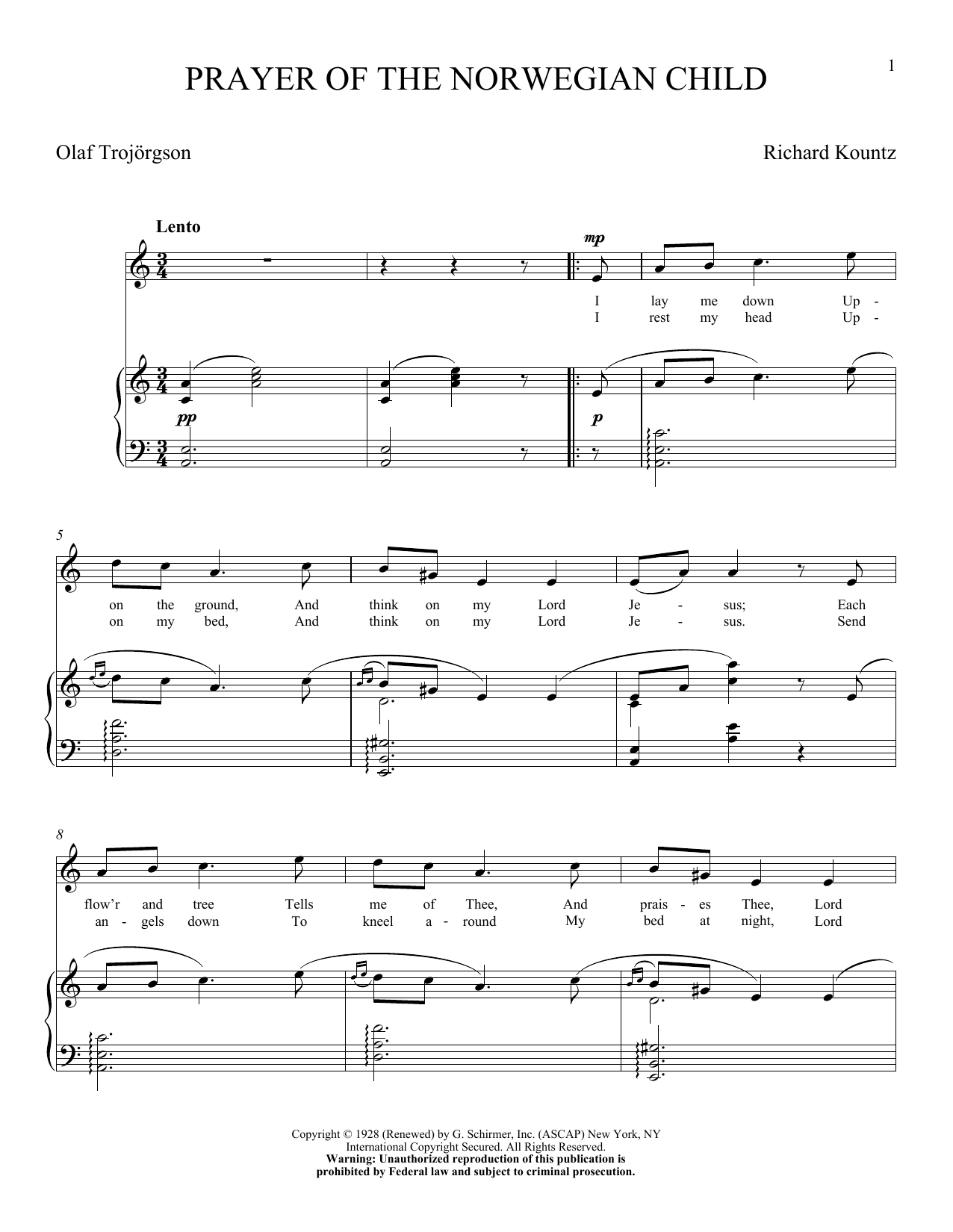 Download or print Olaf Trojargson Prayer Of The Norwegian Child sheet music, chords and digital score arranged for Piano & Vocal. This Sacred score includes 2 page(s).
