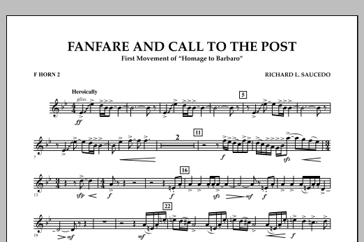 Download or print Richard L. Saucedo Fanfare and Call to the Post - F Horn 2 sheet music, chords and digital score arranged for Concert Band. This Concert score includes 1 page(s).