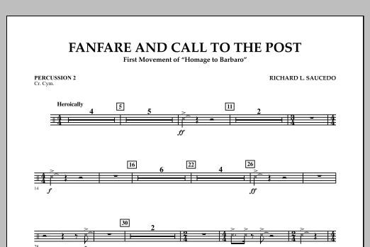 Download or print Richard L. Saucedo Fanfare and Call to the Post - Percussion 2 sheet music, chords and digital score arranged for Concert Band. This Concert score includes 1 page(s).