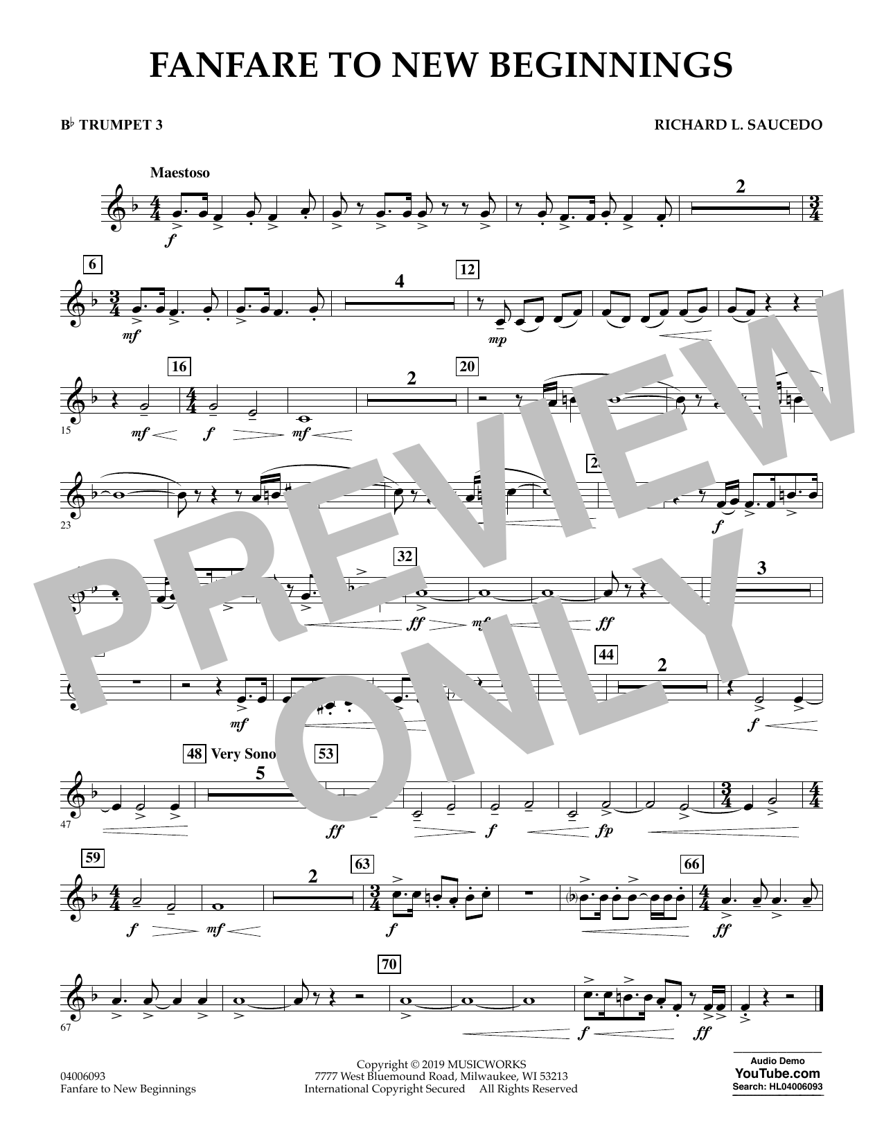 Download or print Richard L. Saucedo Fanfare for New Beginnings - Bb Trumpet 3 sheet music, chords and digital score arranged for Concert Band. This Festival score includes 1 page(s).