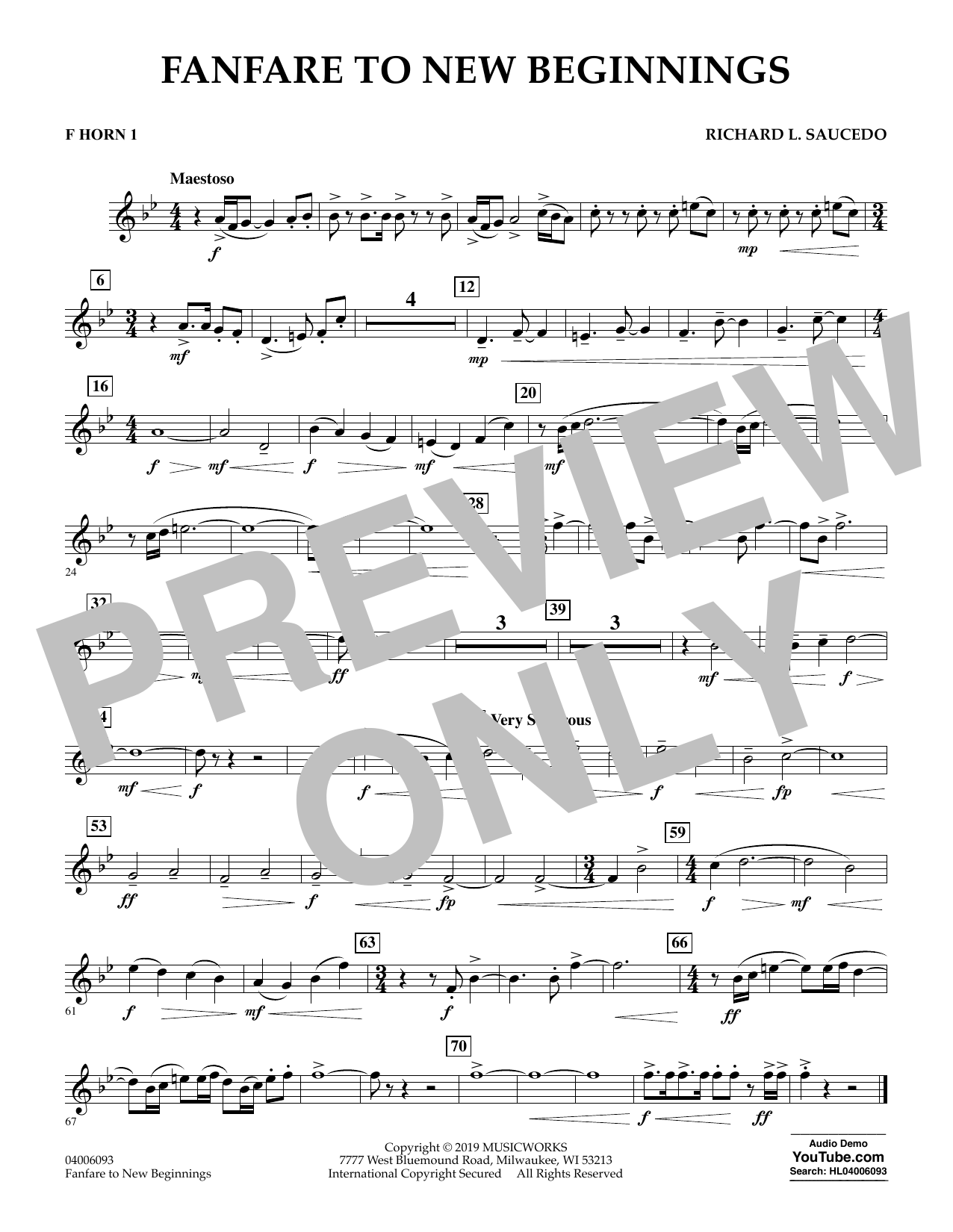 Download or print Richard L. Saucedo Fanfare for New Beginnings - F Horn 1 sheet music, chords and digital score arranged for Concert Band. This Festival score includes 1 page(s).