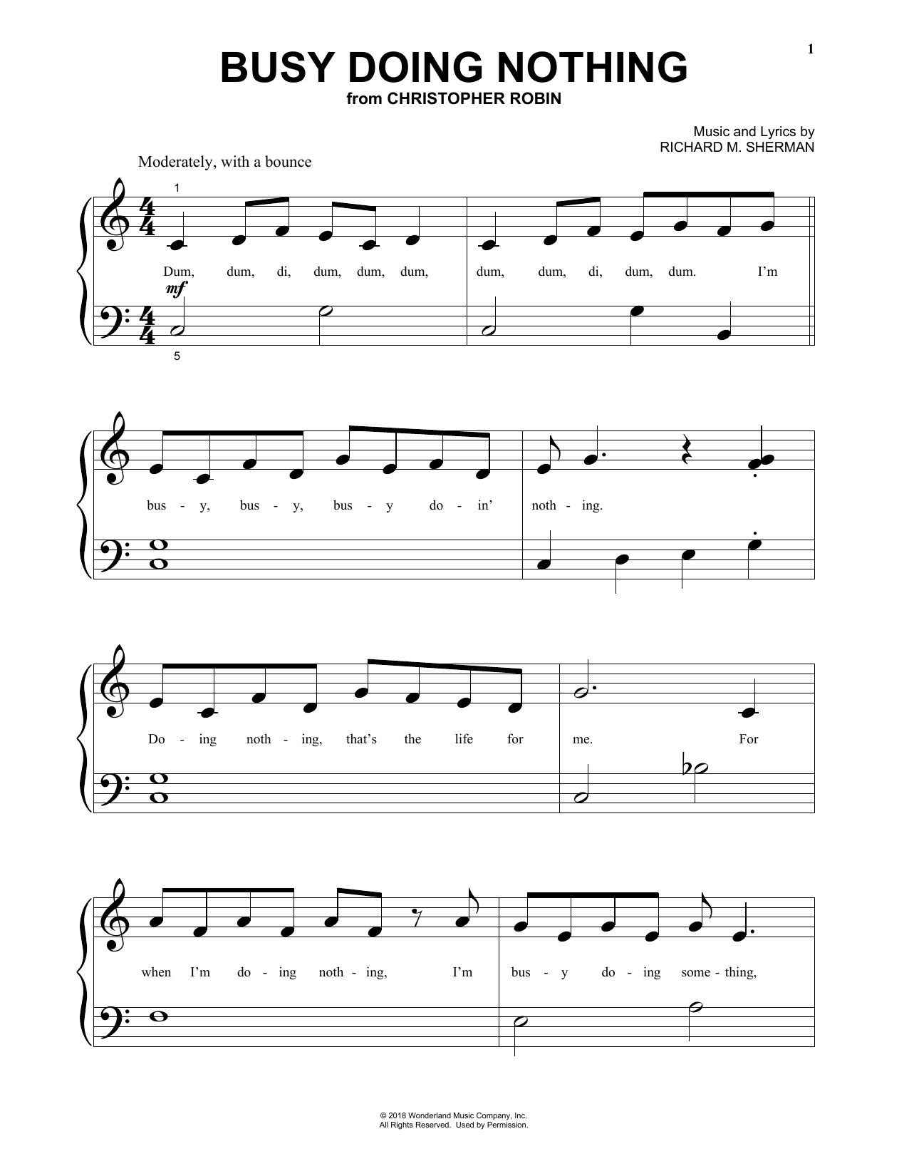 Download or print Richard M. Sherman Busy Doing Nothing (from Christopher Robin) sheet music, chords and digital score arranged for Beginning Piano Solo. This Children score includes 2 page(s).