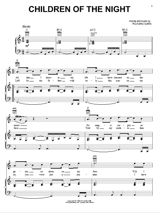 Download or print Richard Marx Children Of The Night sheet music, chords and digital score arranged for Easy Piano. This Rock score includes 5 page(s).