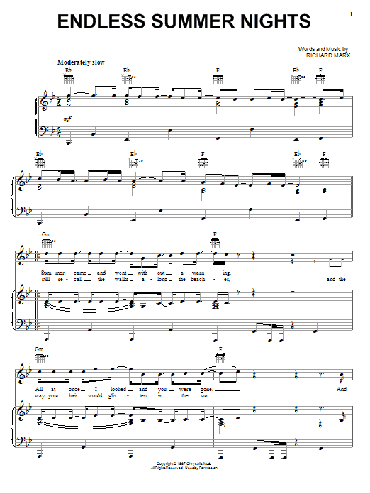 Download or print Richard Marx Endless Summer Nights sheet music, chords and digital score arranged for Piano, Vocal & Guitar Chords (Right-Hand Melody). This Pop score includes 5 page(s).